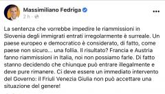 “Questa ordinanza è incomprensibile”, continua il segretario di Fratelli d’Italia, “non si capisce infatti, il motivo per cui l’Italia non può fare con la Slovenia quello che la Francia fa con l’Italia a Ventimiglia e l’Austria con l’Italia al Brennero. Eppure la Carta Europea dei Diritti Fondamentali è la stessa per tutti (per la Francia, per l’Austria, per la Slovenia e per l’Italia). A questo punto”, attacca Giacomelli, “possiamo ritirare le pattuglie dal confine perché la loro funzione potrà essere solo quella di accompagnare i clandestini in questura per redigere la domanda di asilo”.