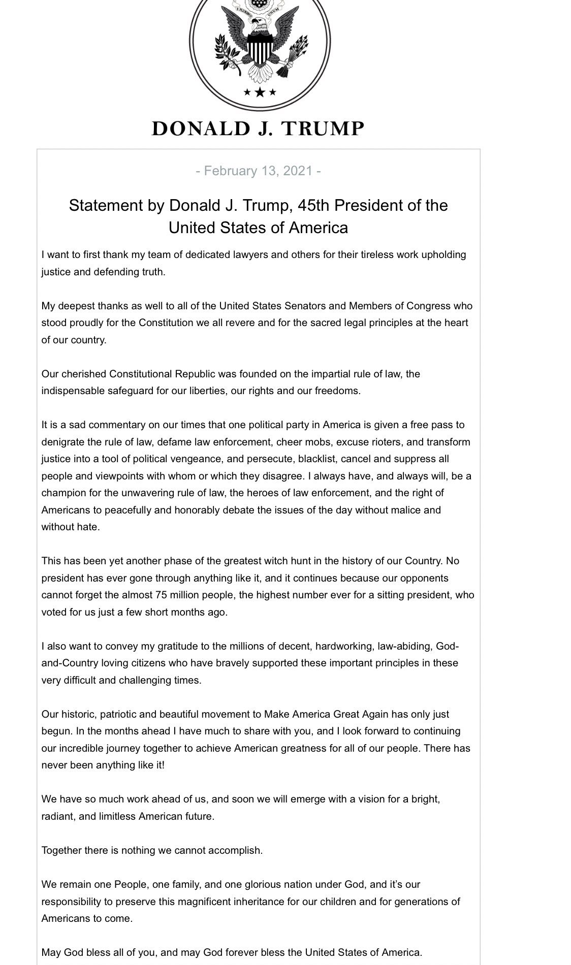 🔵 Con l'assoluzione nel secondo processo l'#impeachment, è finita una "caccia alle streghe". Lo afferma l'ex presidente #Usa Donald #Trump in una dichiarazione subito dopo la votazione in Senato. Trump aggiunge di volere "continuare" a difendere "la grandezza dell'#America".