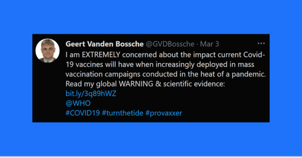 In un video pubblicato su YouTube l’8 marzo 2021, dal titolo Mass Vaccination in a Pandemic – Benefits versus Risks: Interview with Geert Vanden Bossche, il virologo Bossche viene intervistato e spiega i rischi della vaccinazione. Tema trattato anche in un articolo pubblicato sul sito Covexit.com.