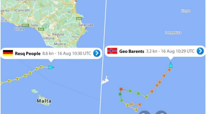 La nave #ResQPeople della ONG @resqpeople, con a bordo 166 #migranti e la volontaria Cecilia Strada, è già in prossimità della Sicilia, mentre la #GeoBarents di @MSF_ITALIA, con a bordo 214 migranti (189 trasbordati in ACQUE TERRITORIALI TUNISINE), sta puntando Lampedusa. pic.twitter.com/RaD7cqkjUZ