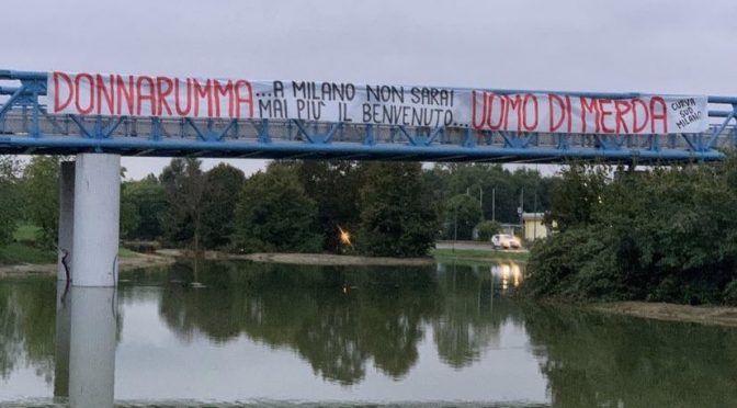 Striscione della CURVA SUD apparso a Milano contro #Donnarumma. pic.twitter.com/HQD0WxANTs