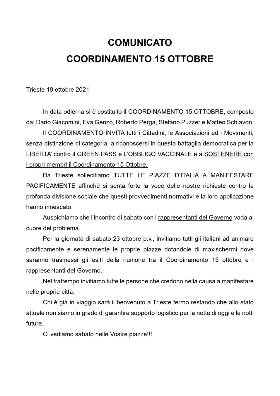 Per la giornata di sabato #23ottobre invitiamo tutti gli italiani ad animare pacificamente le proprie piazze”…#portualidiTrieste pic.twitter.com/9kJnLdi8DO— Francesca Totolo 2 (@fratotolo2) October 19, 2021