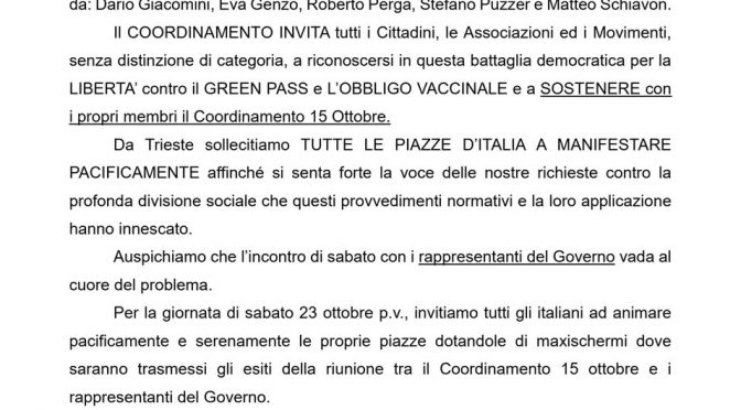 Per la giornata di sabato #23ottobre invitiamo tutti gli italiani ad animare pacificamente le proprie piazze”…#portualidiTrieste pic.twitter.com/9kJnLdi8DO— Francesca Totolo 2 (@fratotolo2) October 19, 2021