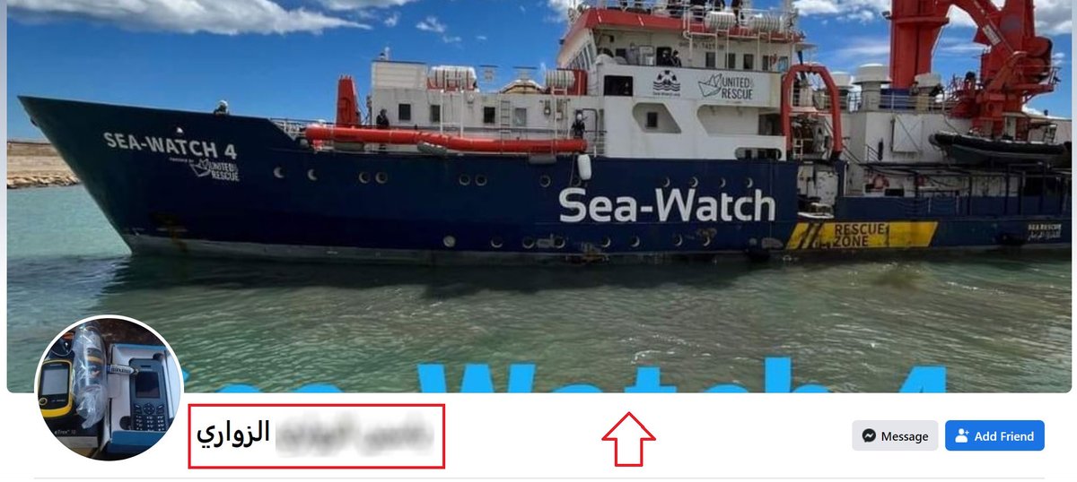 L’immagine utilizzata nel profilo Facebook dello scafista raffigura la nave della ONG tedesca SeaWatch4, implicando contatto diretto, garanzia e certezza dei servizi.