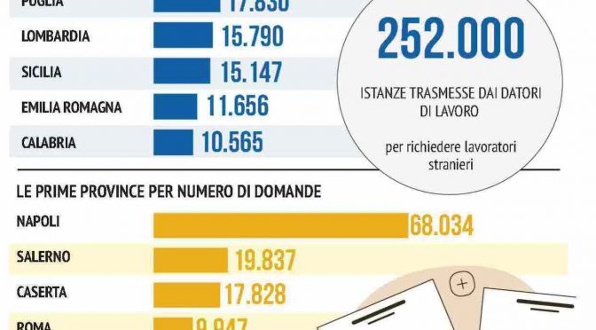 Su questa notizia: Pd e Camorra d’accordo: “Italia ha bisogno di immigrati” Vox Non c’è alcuna possibilità che la Campania abbia bisogno di 10 volte tanti immigrati rispetto alla Lombardia: E no, non c’entra il reddito di cittadinanza. C’entra la criminalità e i famigerati CAF. E un premier che fa sanatorie mascherate. Ecco la truffa … Leggi tutto La truffa del Decreto Flussi in un’immagine: tutti i finti lavoratori a Napoli