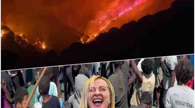 La Sicilia brucia, ma le forze dell’ordine sono utilizzate per traghettare e badare ai clandestini che la Meloni trasferisce ogni giorno da Lampedusa a botte di mille/duemila.