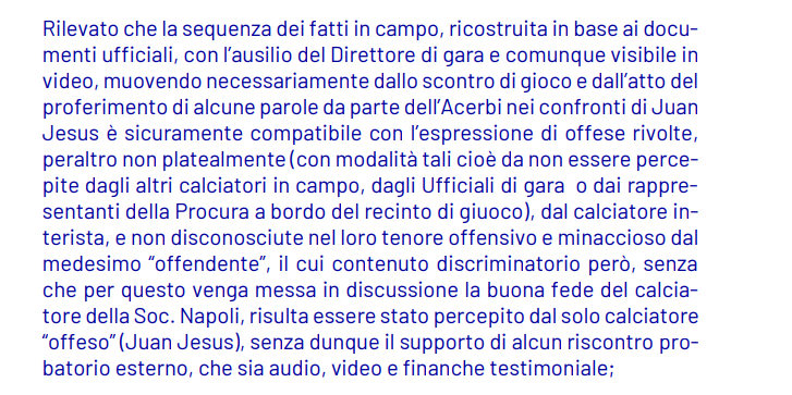 Francesco Acerbi, difensore dell’Inter, è stato assolto dal Giudice Sportivo per presunti insulti razzisti a Juan Jesus durante la partita Inter-Napoli¹²⁴. La decisione è arrivata dopo una lunga attesa e ha messo fine alla delirante questione¹⁴.