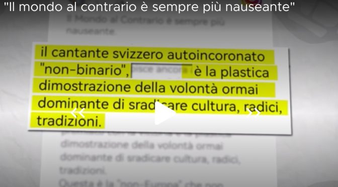 (1) Roberto Vannacci sul vincitore dell’Eurovision: “Il Mondo al Contrario è sempre più nauseante”. https://news.fidelityhouse.eu/politica/roberto-vannacci-sul-vincitore-delleurovision-il-mondo-al-contrario-e-sempre-piu-nauseante-609717.html.