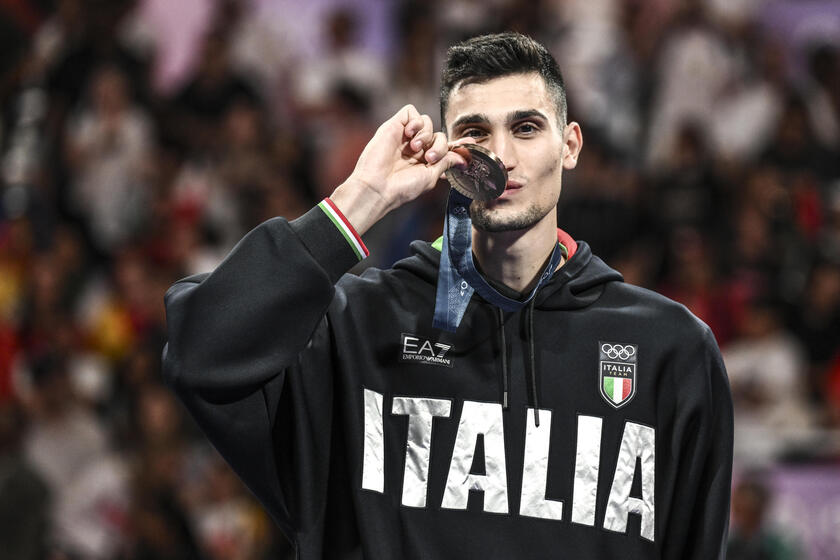 Parigi: il taekwondo sul podio, Alessio è di bronzo Agosto 11, 2024 840 × 560 Medaglie Italia, solo la sinistra di Egonu vede nero Simone Alessio of Italy celebrates on the podium his Men 80kg Bronze medal of the Taekwondo competitions in the Paris 2024 Olympic Games, at the Grand Palais in Paris, France, 09 August 2024. ANSA/CIRO FUSCO Vox Condividi!