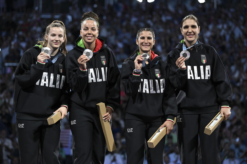 Silver medalists Italy’ (L-R) Martina Favaretto, Alice Volpi, Francesca Palumbo e Arianna Errigo celebrate during award cerewmony for the Women Foil Team competition in the Paris 2024 Olympic Games, at the Grand Palais in Paris, France, 01 August 2024. ANSA/ Ciro Fusco