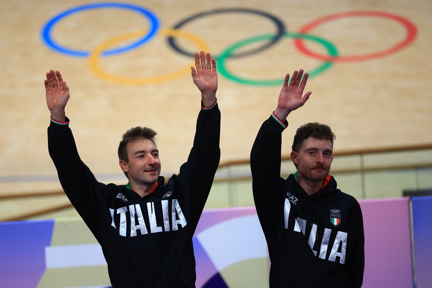 epa11543675 Elia Viviani (L) and Simone Consonni of Italy gesture during the medal ceremony of the Men’s Madison at the Track Cycling competitions in the Paris 2024 Olympic Games, at Saint-Quentin-en-Yvelines Velodrome in Saint-Quentin-en-Yvelines, France, 10 August 2024. EPA/MARTIN DIVISEK