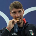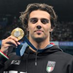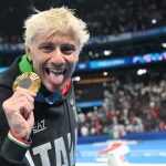 Italian Nicolo’ Martinenghi celebrates after winning the gold medal in the Men’s 100m Breaststroke Final of the Swimming competitions during the Paris 2024 Olympic Games at the Paris La Defense Arena in Paris, France, 28 July 2024. Summer Olympic Games will be held in Paris from 26 July to 11 August 2024. ANSA/ETTORE FERRARI