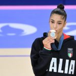 Italy’s Sofia Raffaeli celebrates on the podium after winning the bronze medal in the Individual All-Around final of the Rhythmic Gymnastics competitions in the Paris 2024 Olympic Games, at the La Chapelle Arena in Paris, France, 09 August 2024. ANSA/ETTORE FERRARI