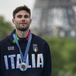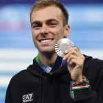 epa11526029 Silver medalist Gregorio Paltrinieri of Italy poses for photos after the medal ceremony for the Men 1500m Freestyle final of the Swimming competitions in the Paris 2024 Olympic Games, at the Paris La Defense Arena in Paris, France, 04 August 2024. EPA/MAST IRHAM
