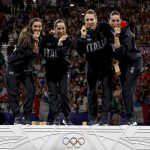 Team Italy poses with the silver medal during the podium ceremony for the artistic gymnastics women’s team final during the Paris 2024 Olympic Games at the Bercy Arena in Paris, on July 30, 2024. (Photo by Loic VENANCE / AFP)