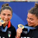 Gold medallists Italy’s Sara Errani and Italy’s Jasmine Paolini pose with their medals after winning the Women Doubles gold medal match of the Tennis competitions in the Paris 2024 Olympic Games, at the Roland Garros in Paris, France, 04 August 2024. ANSA/ETTORE FERRARI