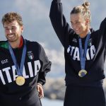 epa11537102 Gold medalists Ruggero Tita and Caterina Banti of Italy during the medal ceremony for the Mixed Multihull event of the Sailing competitions in the Paris 2024 Olympic Games, at the Marseille Marina in Marseille, France, 08 August 2024. EPA/SEBASTIEN NOGIER