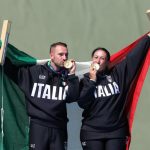 Gold medallists Italy’s Diana Bacosi and Italy’s Gabriele Rossetti celebrate on the podium during the award ceremony for the Skeet Mixed Team Final during the Paris 2024 Olympic Games at Chateauroux Shooting Centre on August 5, 2024. (Photo by Alain JOCARD / AFP)