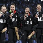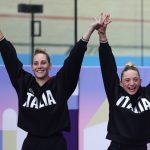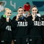 Gold medalist Alice D’ Amato of Italy (L) and bronze medalst Manila Esposito of Italy pose on the podium for the Women Balance Beam final of the Artistic Gymnastics competitions in the Paris 2024 Olympic Games, at the Bercy Arena in Paris, France, 05 August 2024.ANSA/ETTORE FERRARI