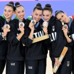Italy’s gymnasts, Martina Centofanti, Agnese Duranti, Alessia Maurelli, Daniela Mogurean and Laura Paris, celebrate on the podium after winning the bronze medal in the Group All-Around Final of the Rhythmic Gymnastics competitions in the Paris 2024 Olympic Games, at the La Chapelle Arena in Paris, France, 10 August 2024. ANSA/ETTORE FERRARI