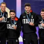 (L-R) Italian Manuel Frigo, Thomas Ceccon, Paolo Conte Bonin and Alessandro Miressi celebrate after winning the bronze medal in the Men’s 4x100m Freestyle Relay Final of the Swimming competitions during the Paris 2024 Olympic Games at the Paris La Defense Arena in Paris, France, 27 July 2024. Summer Olympic Games will be held in Paris from 26 July to 11 August 2024. ANSA/ETTORE FERRARI