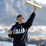 epa11523005 Gold medalist Marta Maggetti of Italy celebrates during the medal ceremony of the Women Windsurfing of the Sailing competitions in the Paris 2024 Olympic Games, in Marseille, France, 03 August 2024. EPA/SEBASTIEN NOGIER